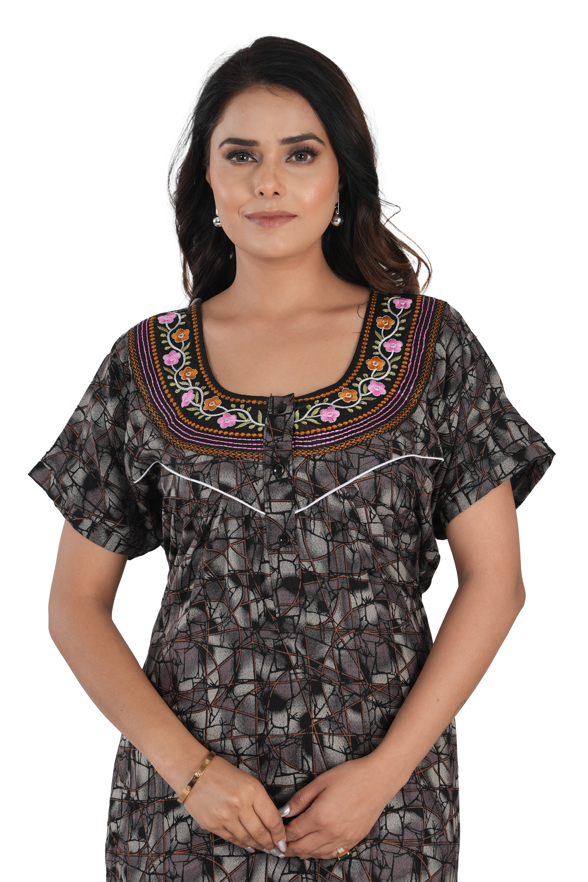 Nighty is a comfortable, loose-fitting garment typically worn by women for sleeping. Made from soft fabrics like cotton or silk, it ensures a restful night's sleep.